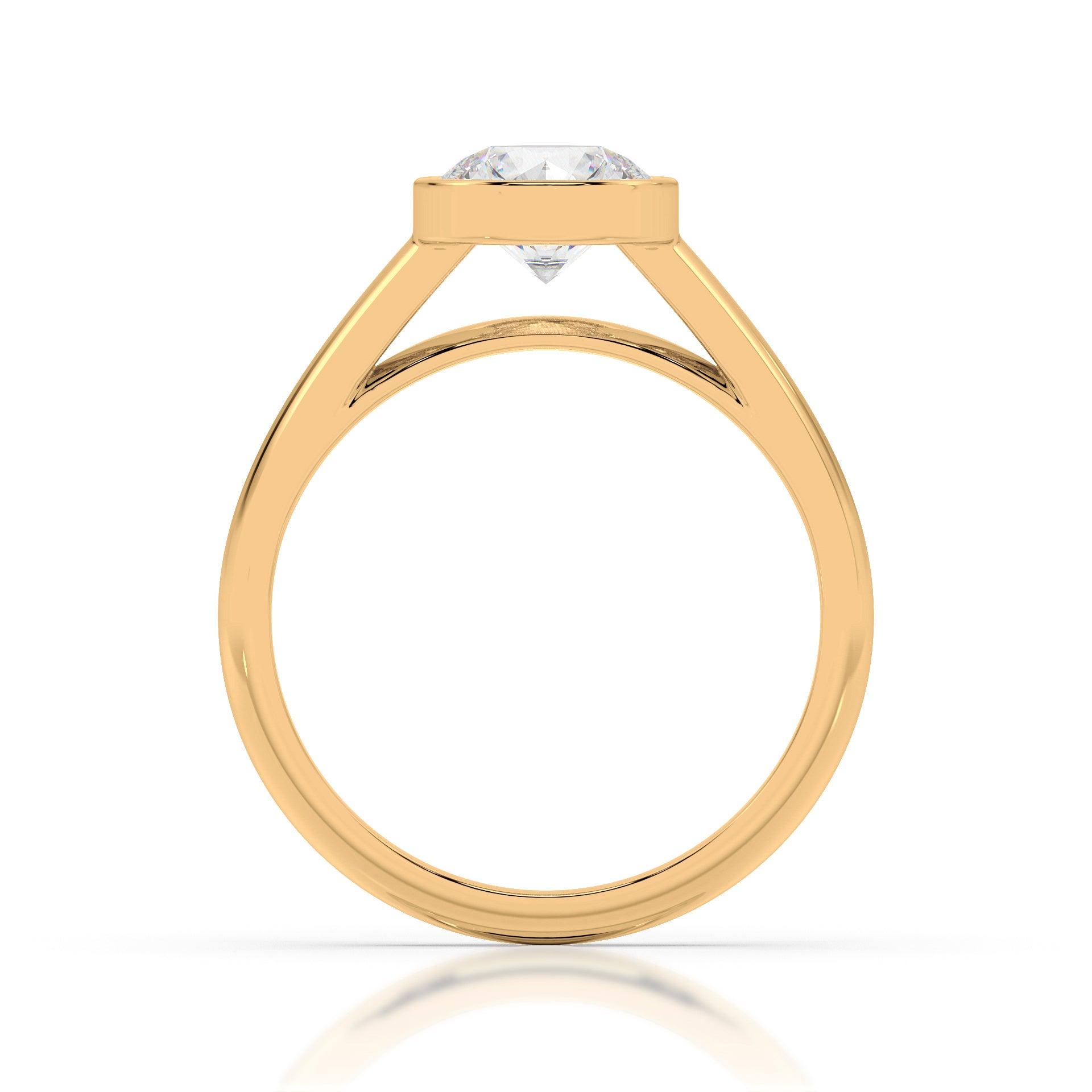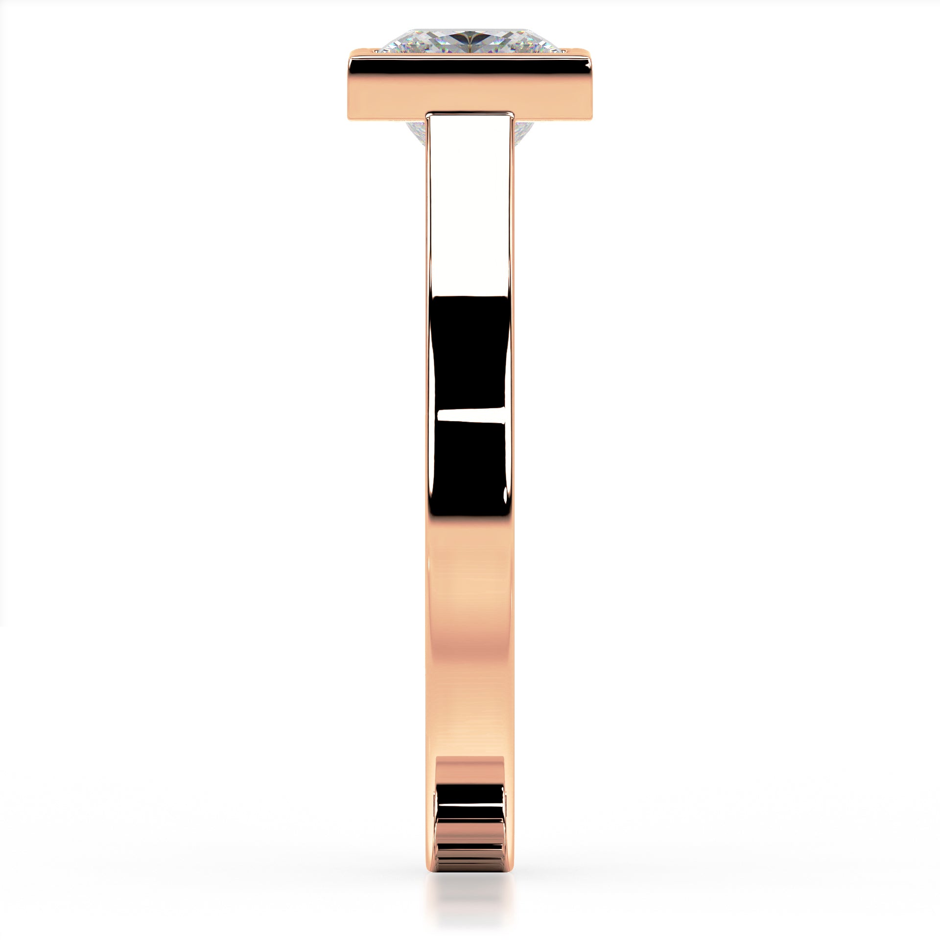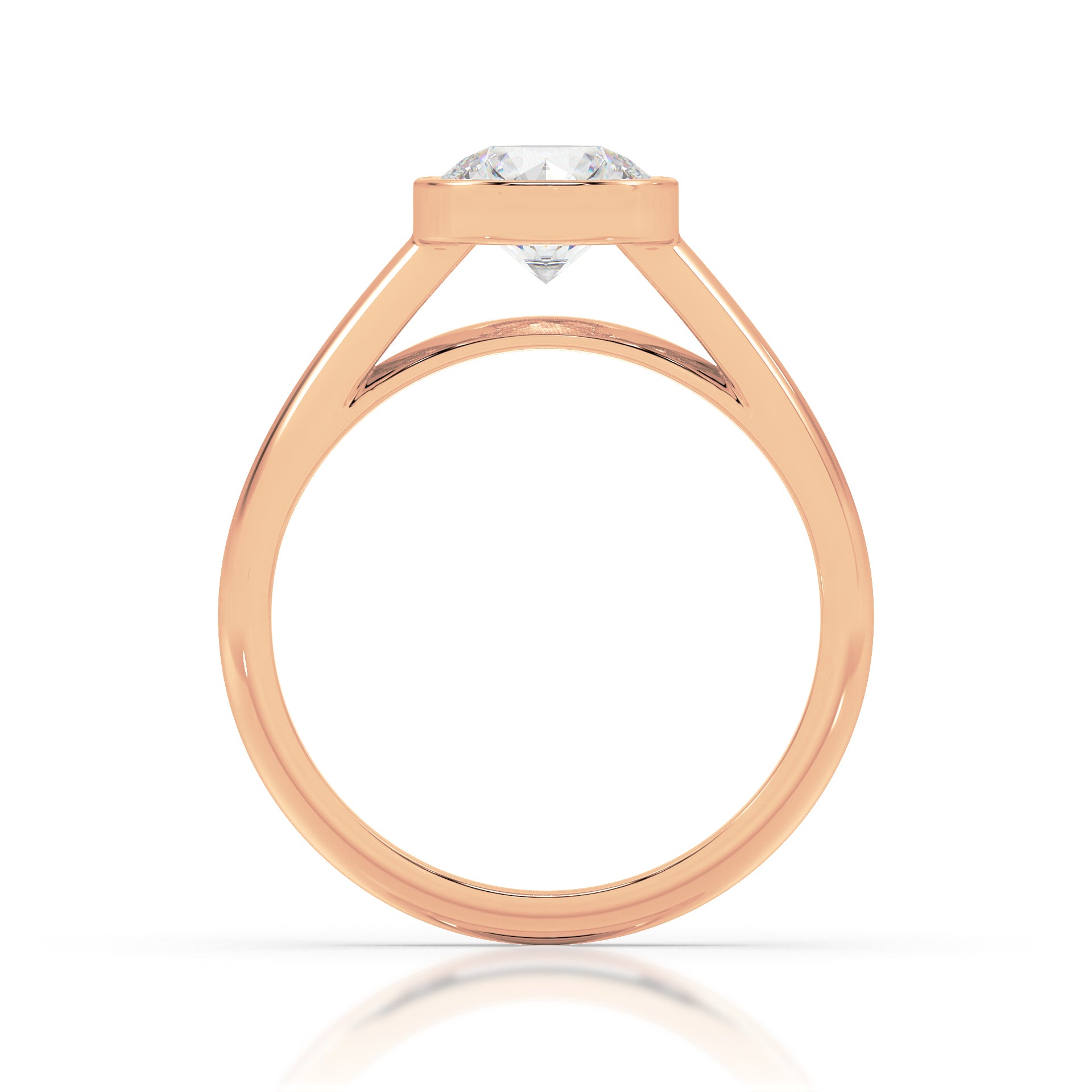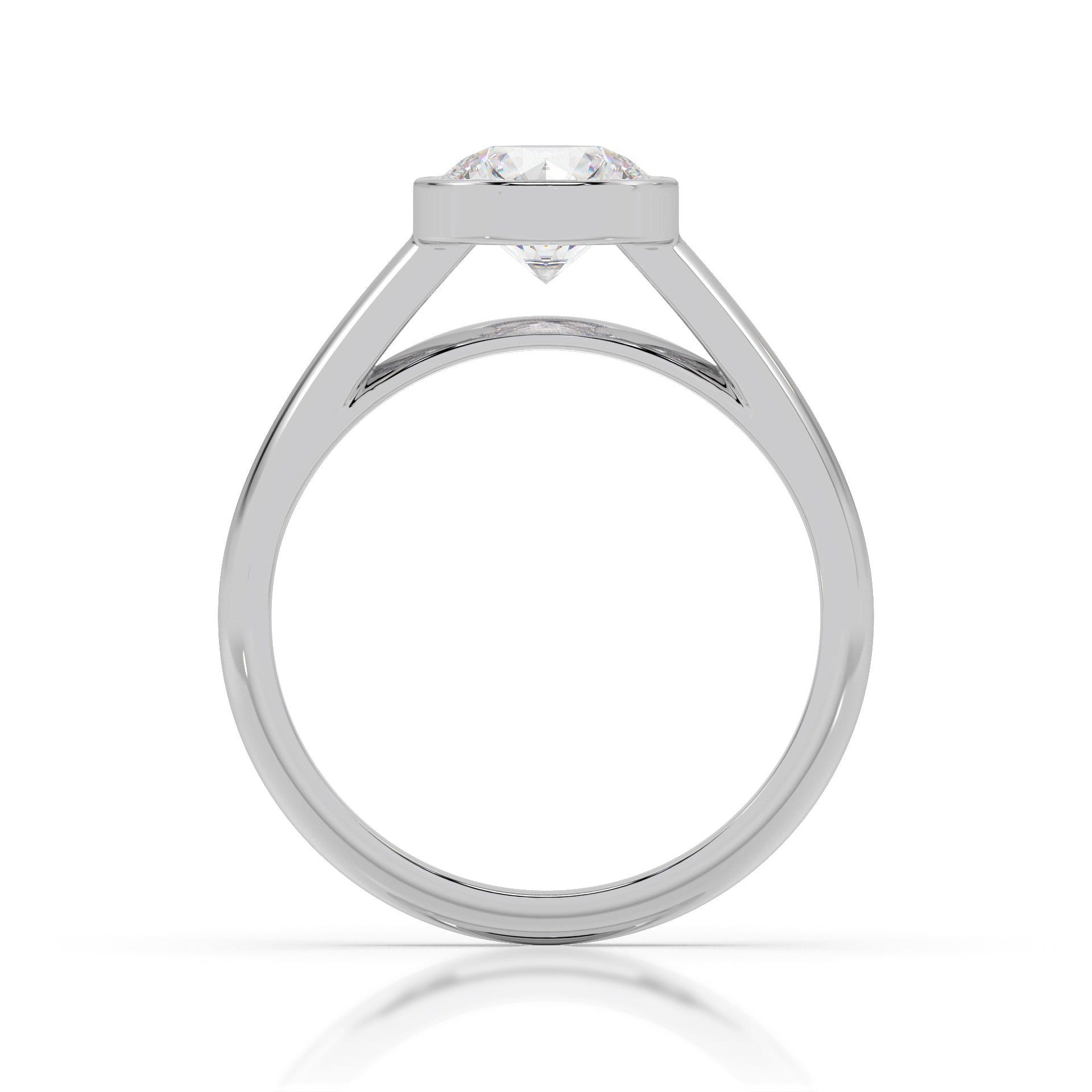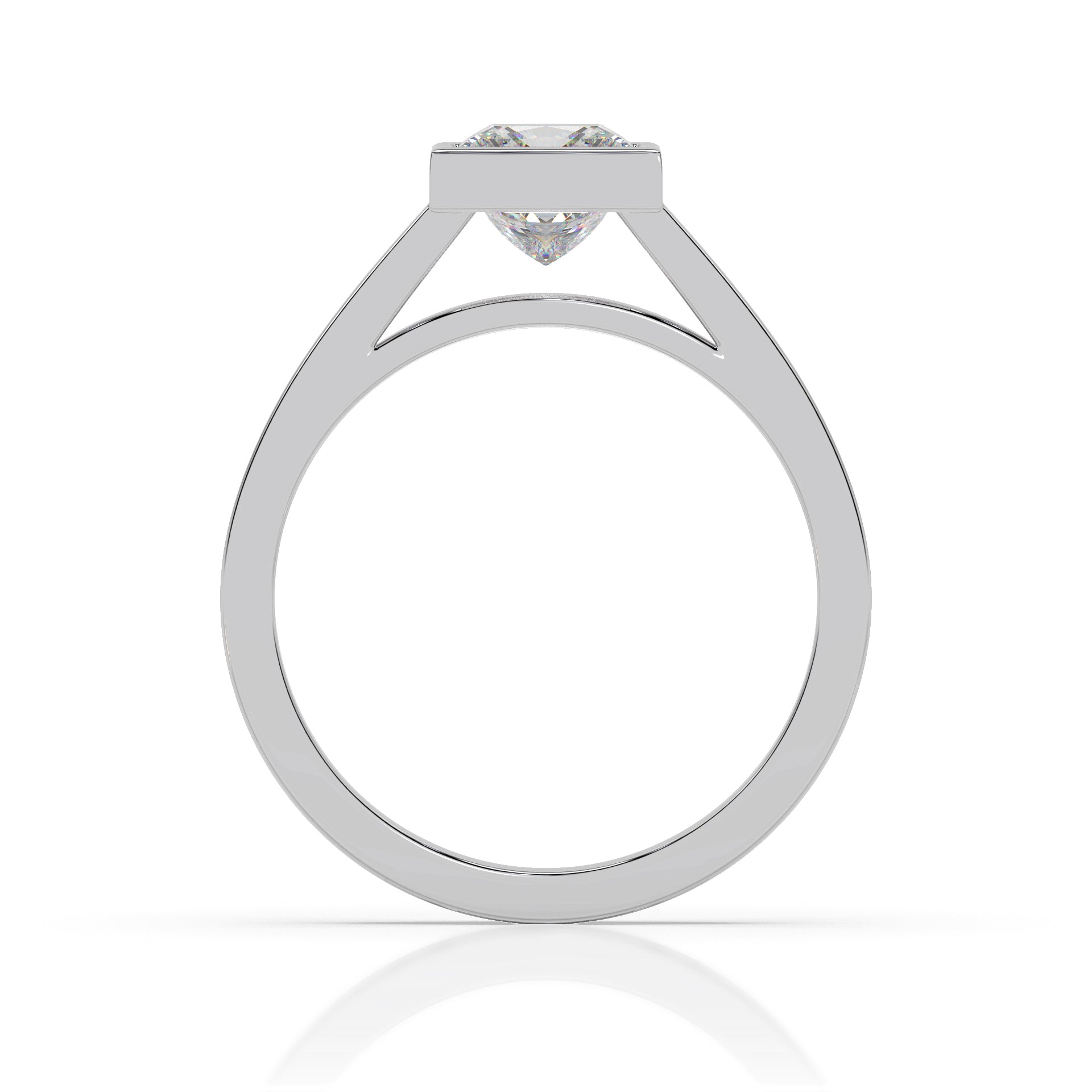 A rubbed-in bezel setting sits atop straight shoulders — a modern take on the cathedral style’s upswept design. Designed with an under-rail so a wedding band can sit flush alongside.