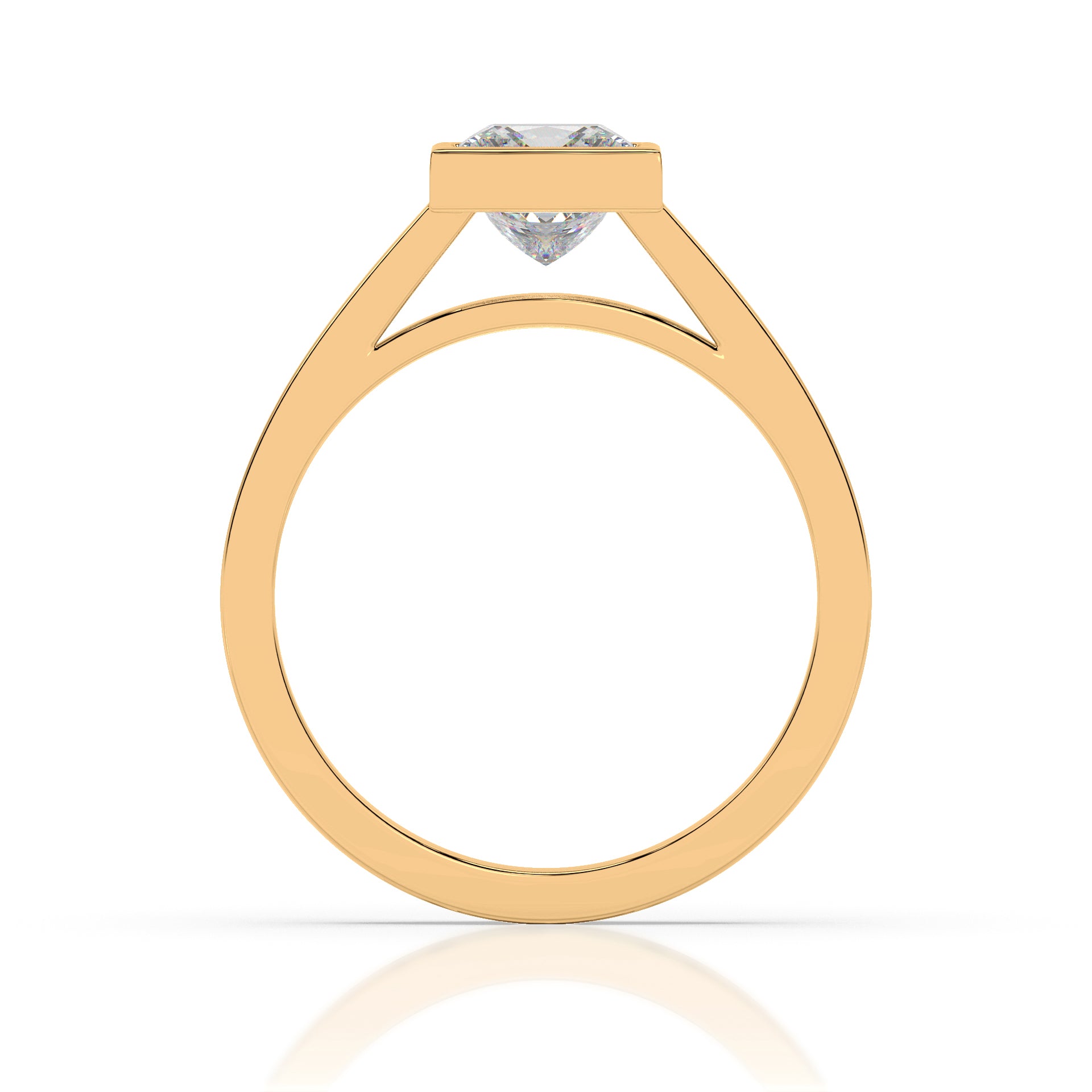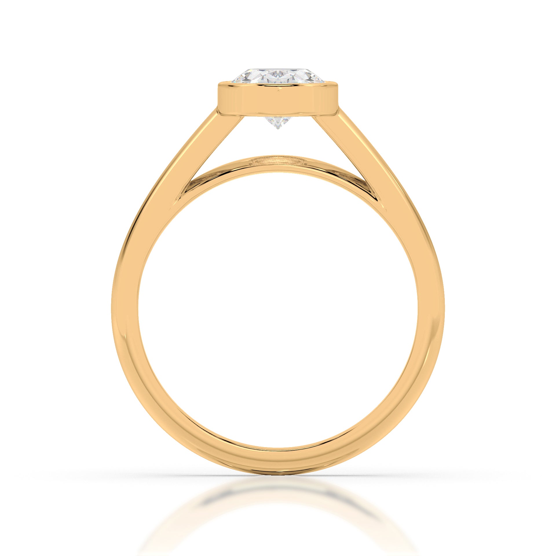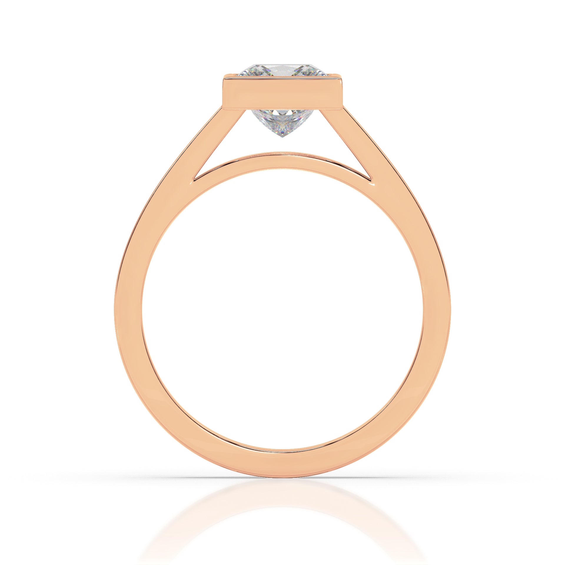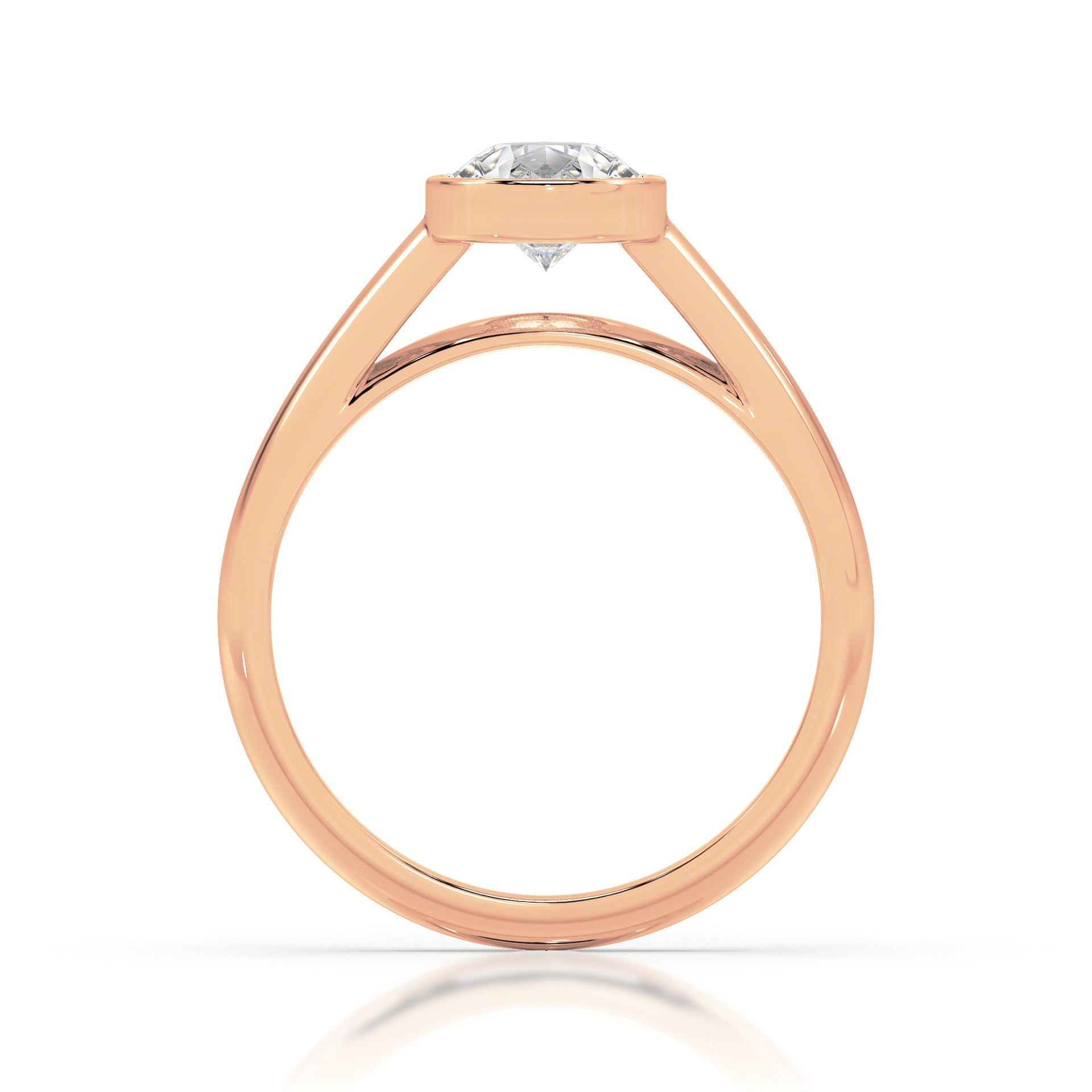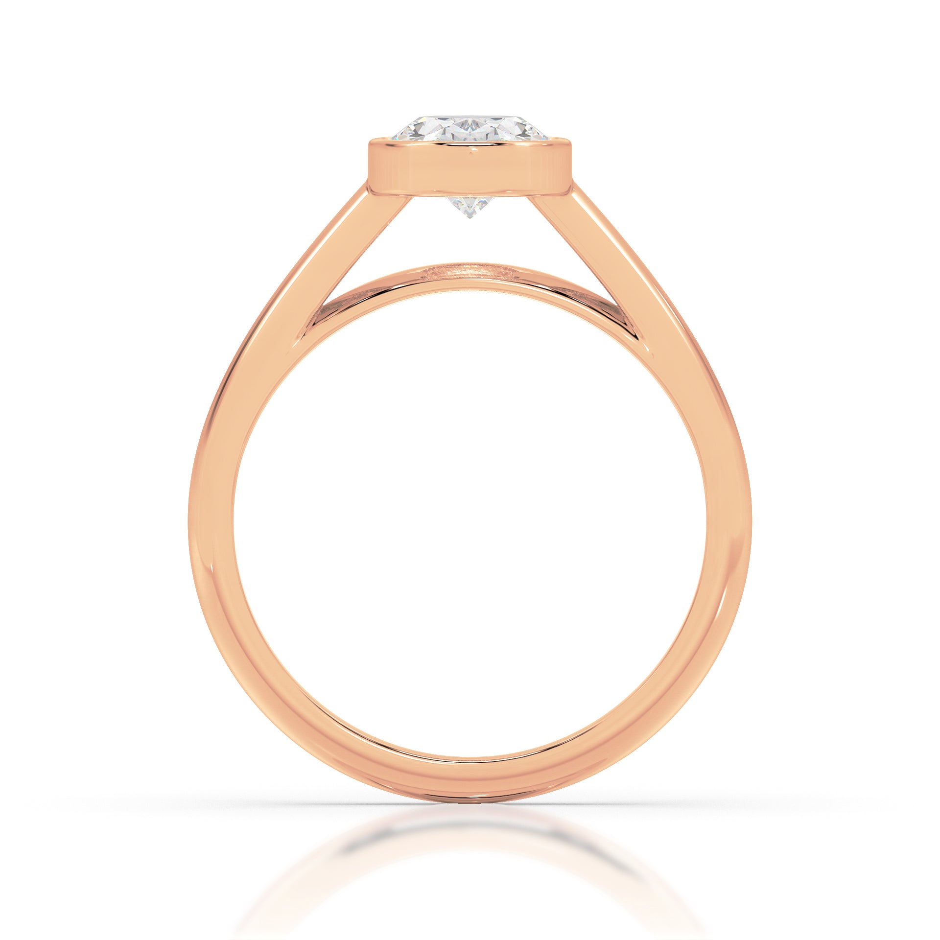 A rubbed-in bezel setting sits atop straight shoulders — a modern take on the cathedral style’s upswept design. Designed with an under-rail so a wedding band can sit flush alongside.