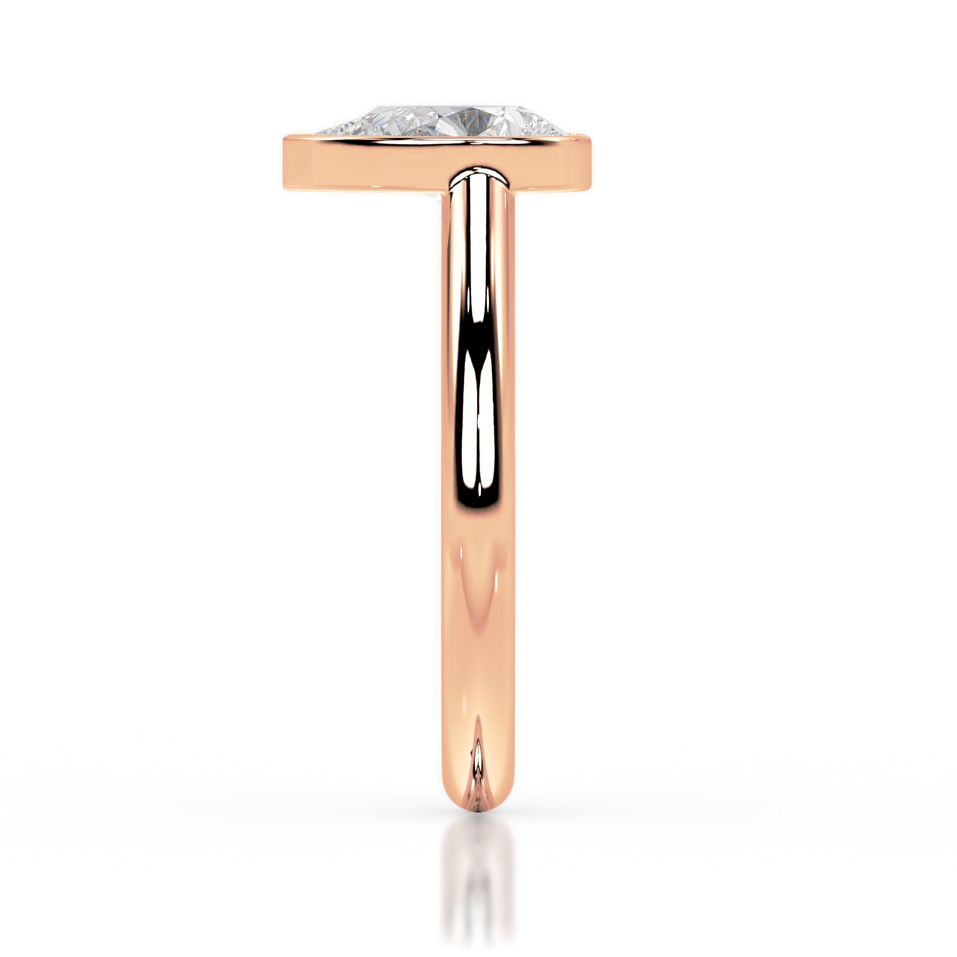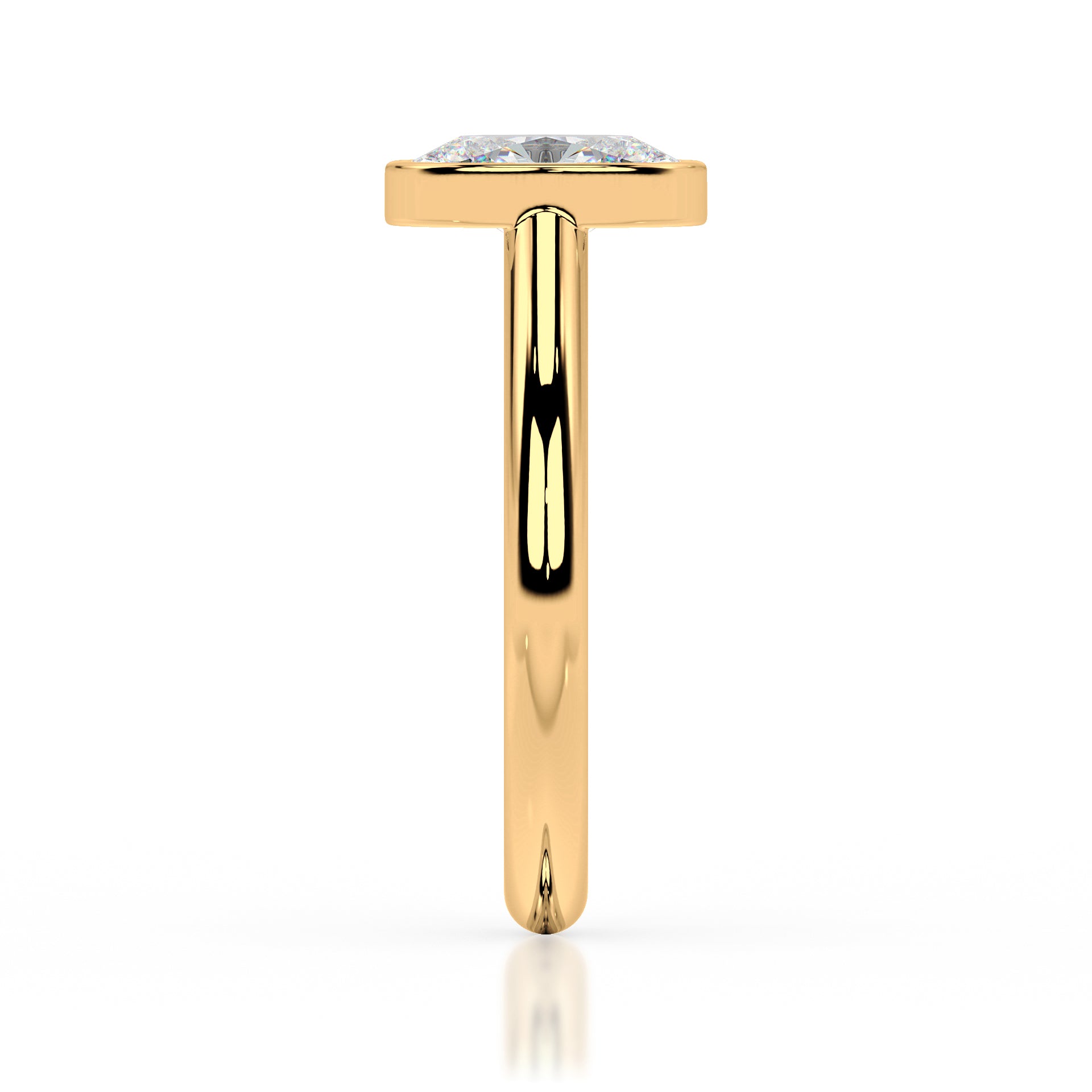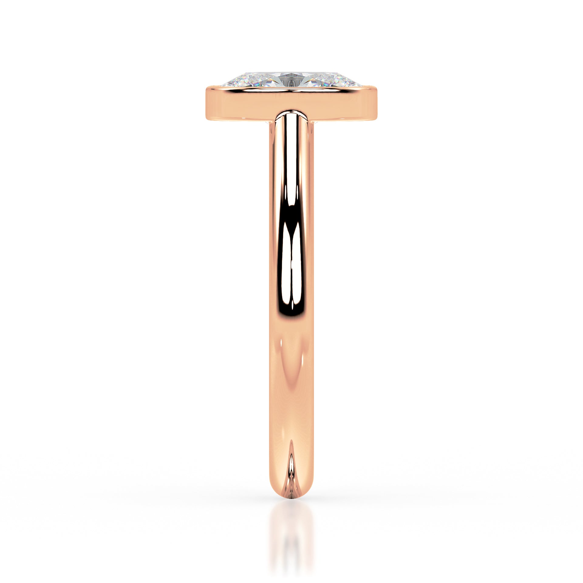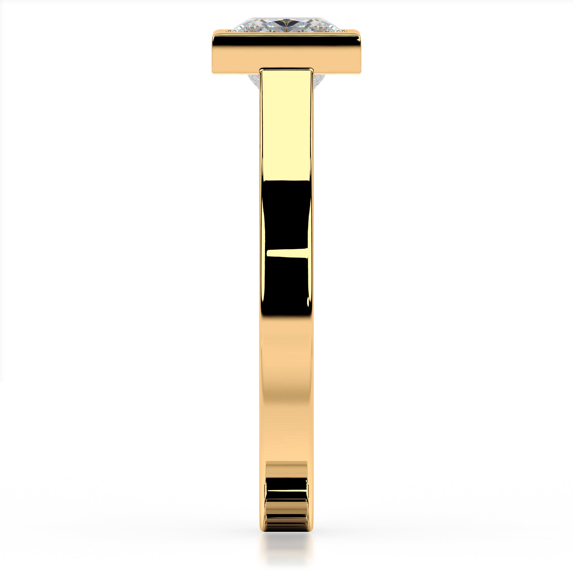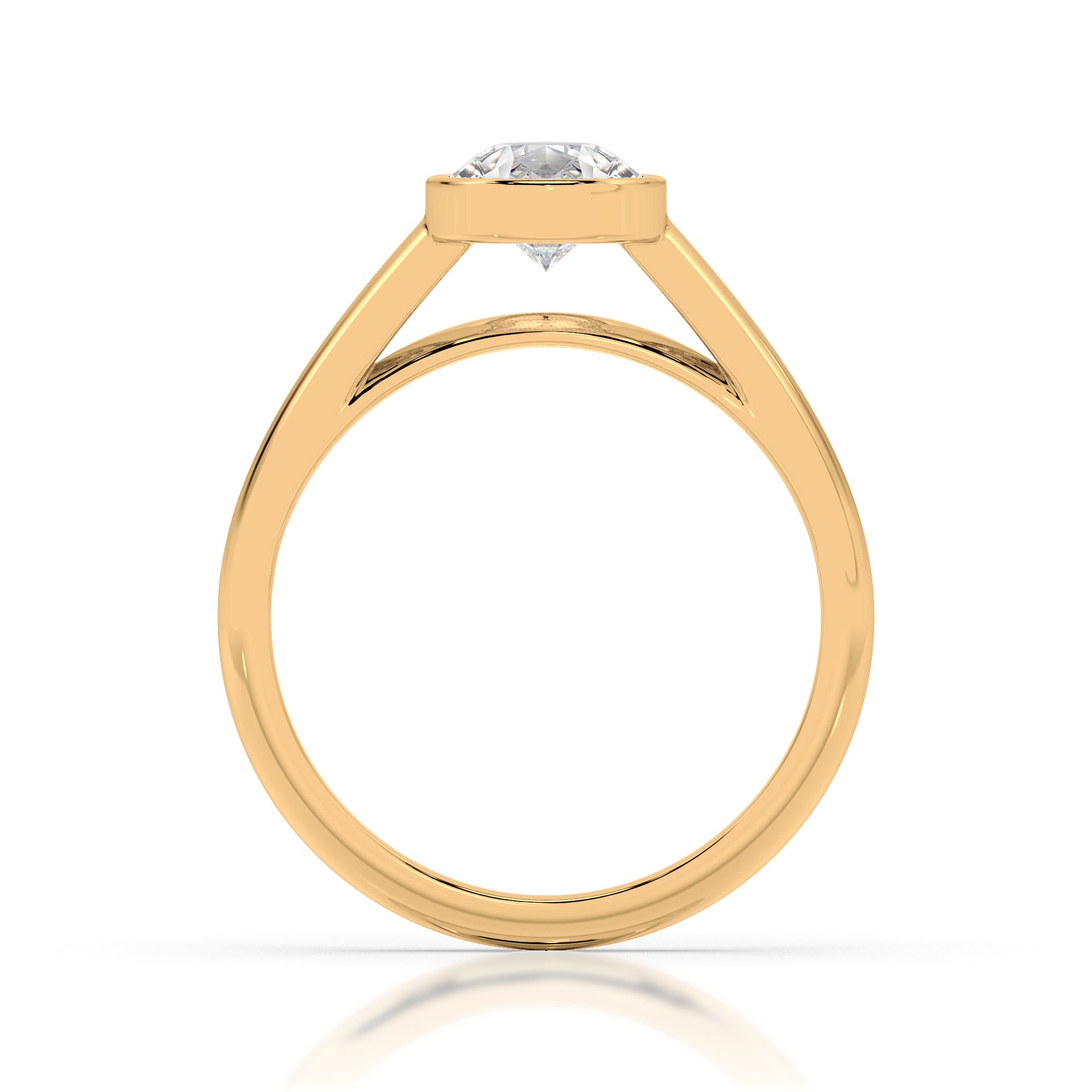 A rubbed-in bezel setting sits atop straight shoulders — a modern take on the cathedral style’s upswept design. Designed with an under-rail so a wedding band can sit flush alongside.