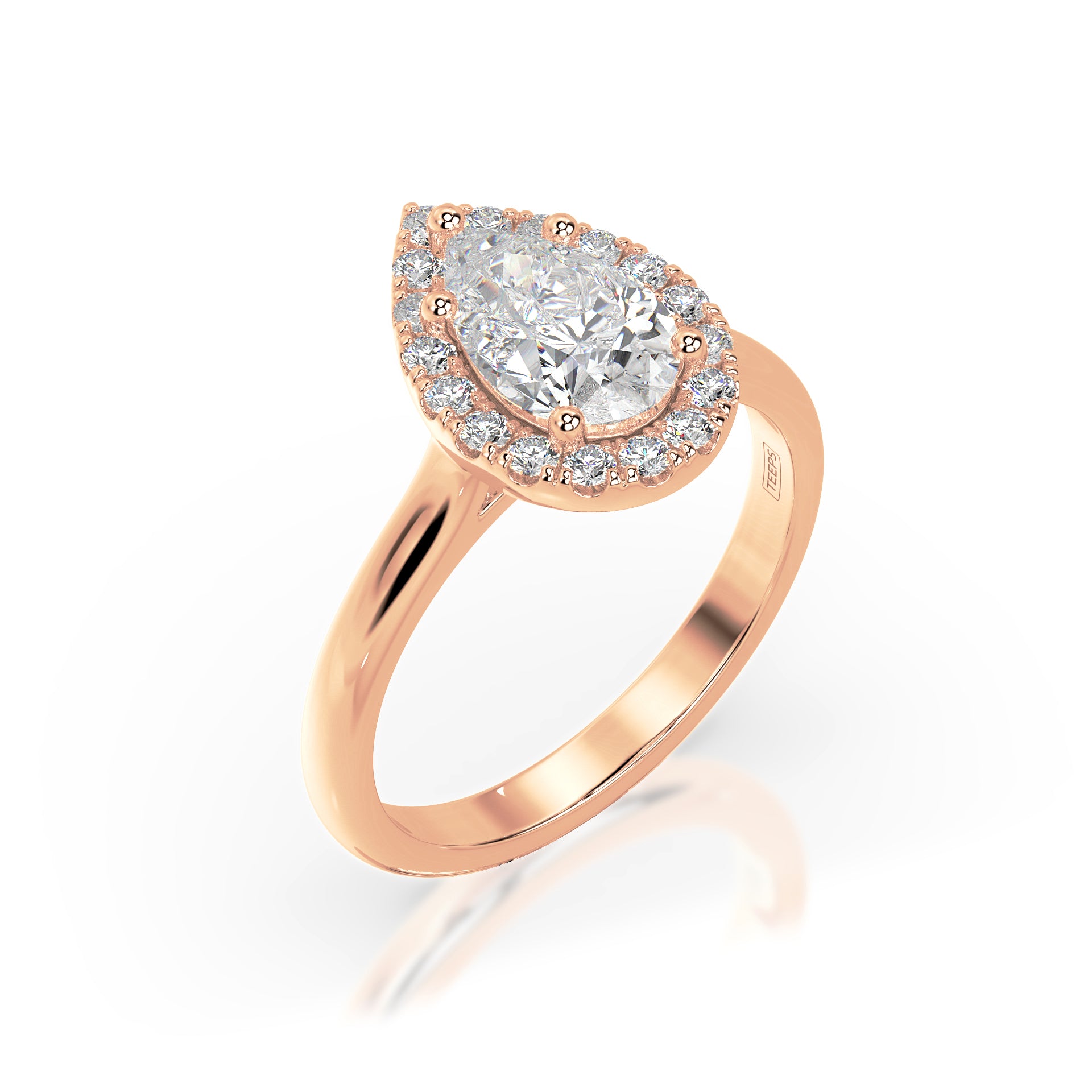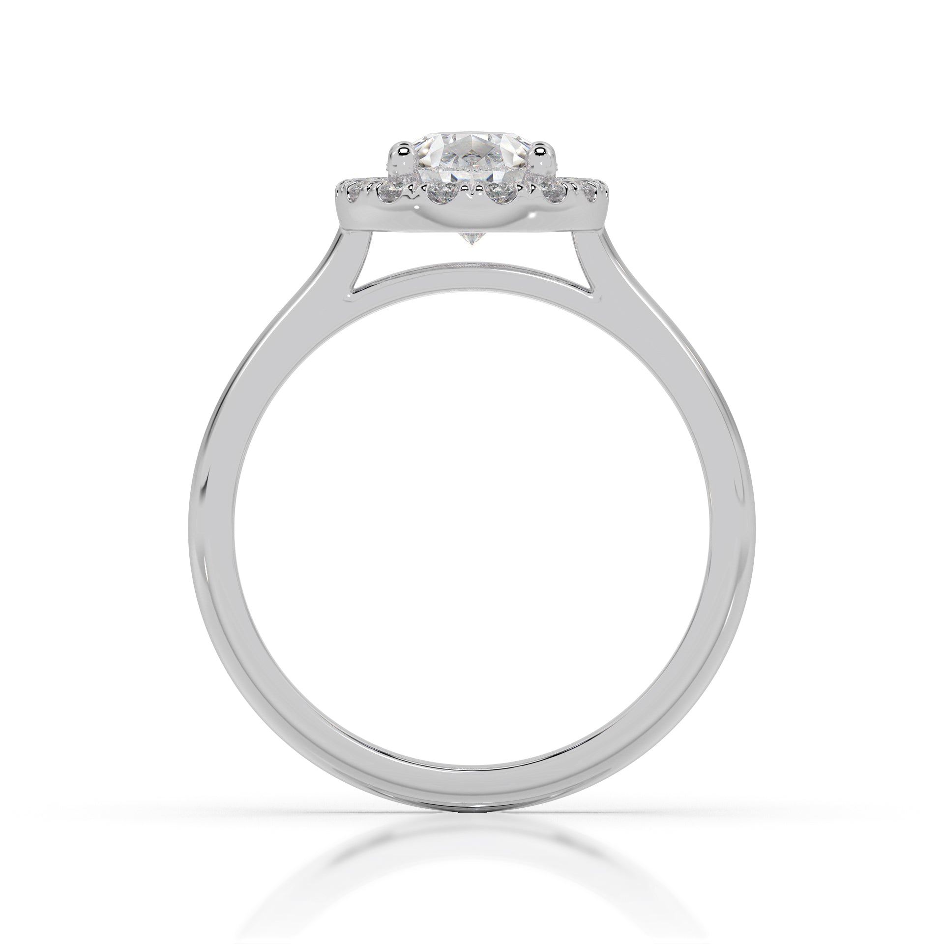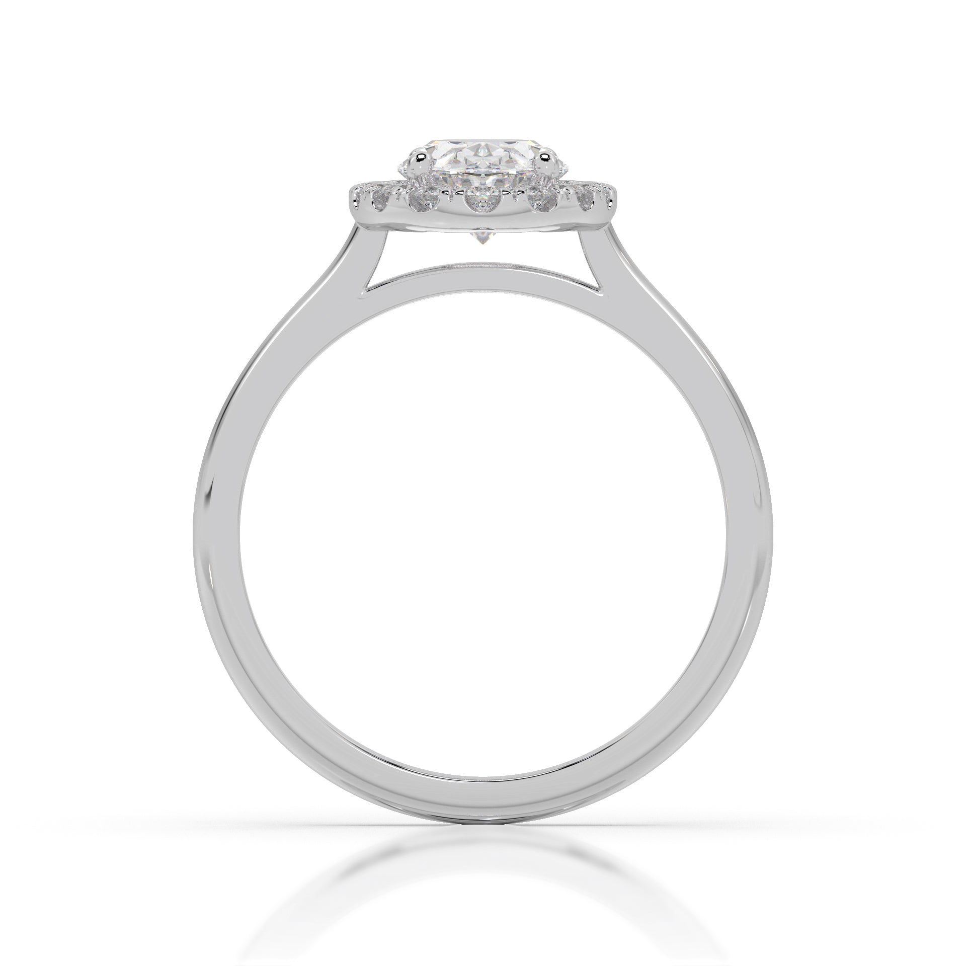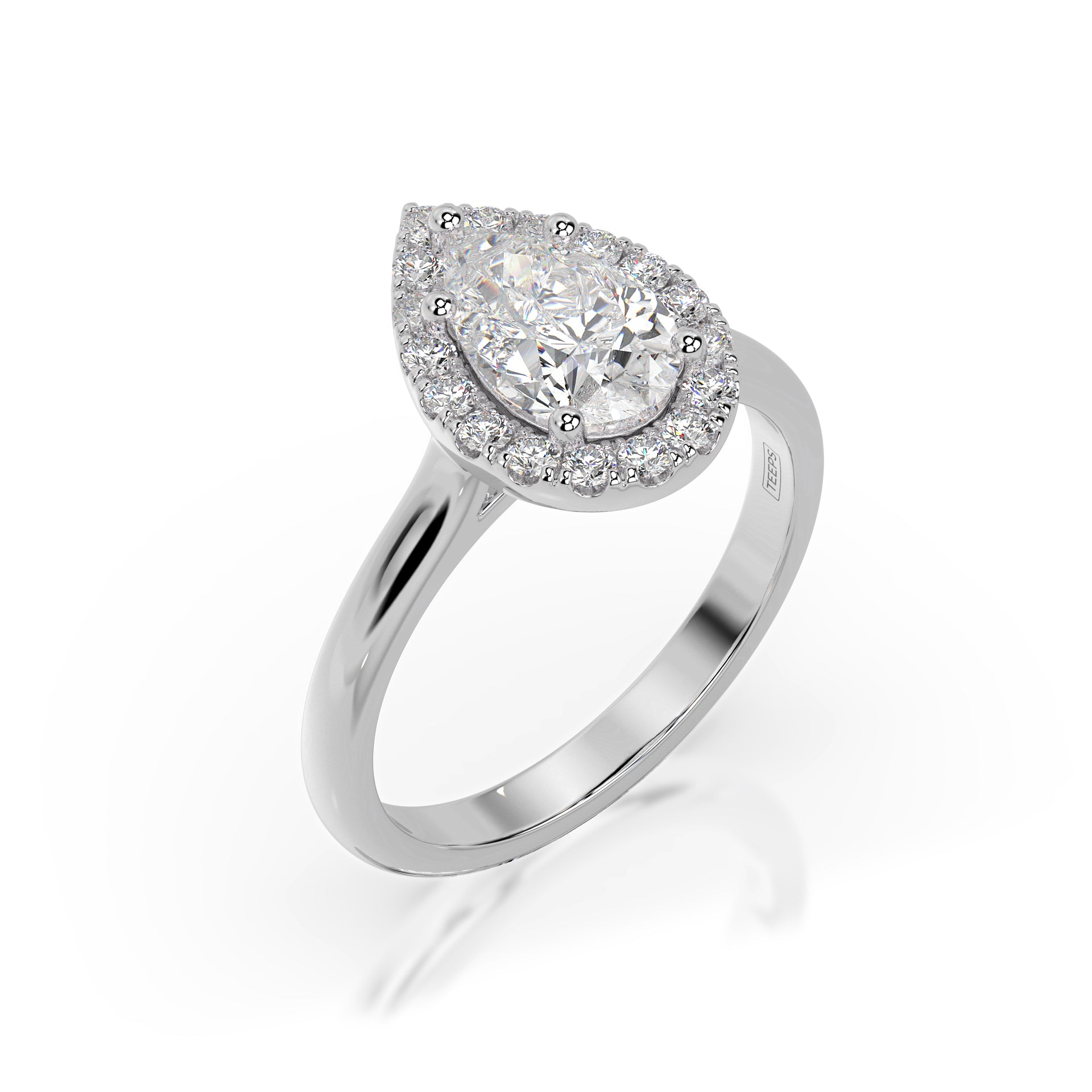 The centre stone is secured with 4 claws (pear-shape version in 5 claws, with an added point claw for protection). Halo diamonds are micro-claw set and back-holed for better cleaning. The setting sits slightly elevated, allowing a wedding band to nestle flush beneath.