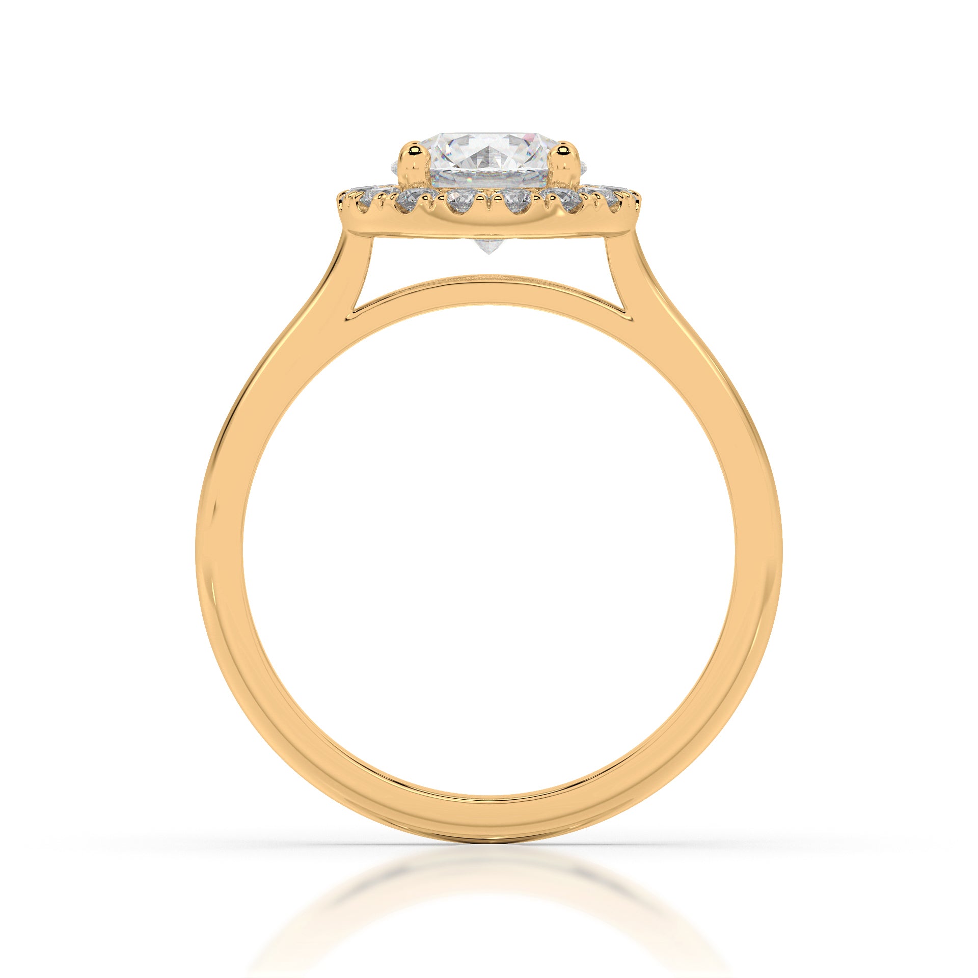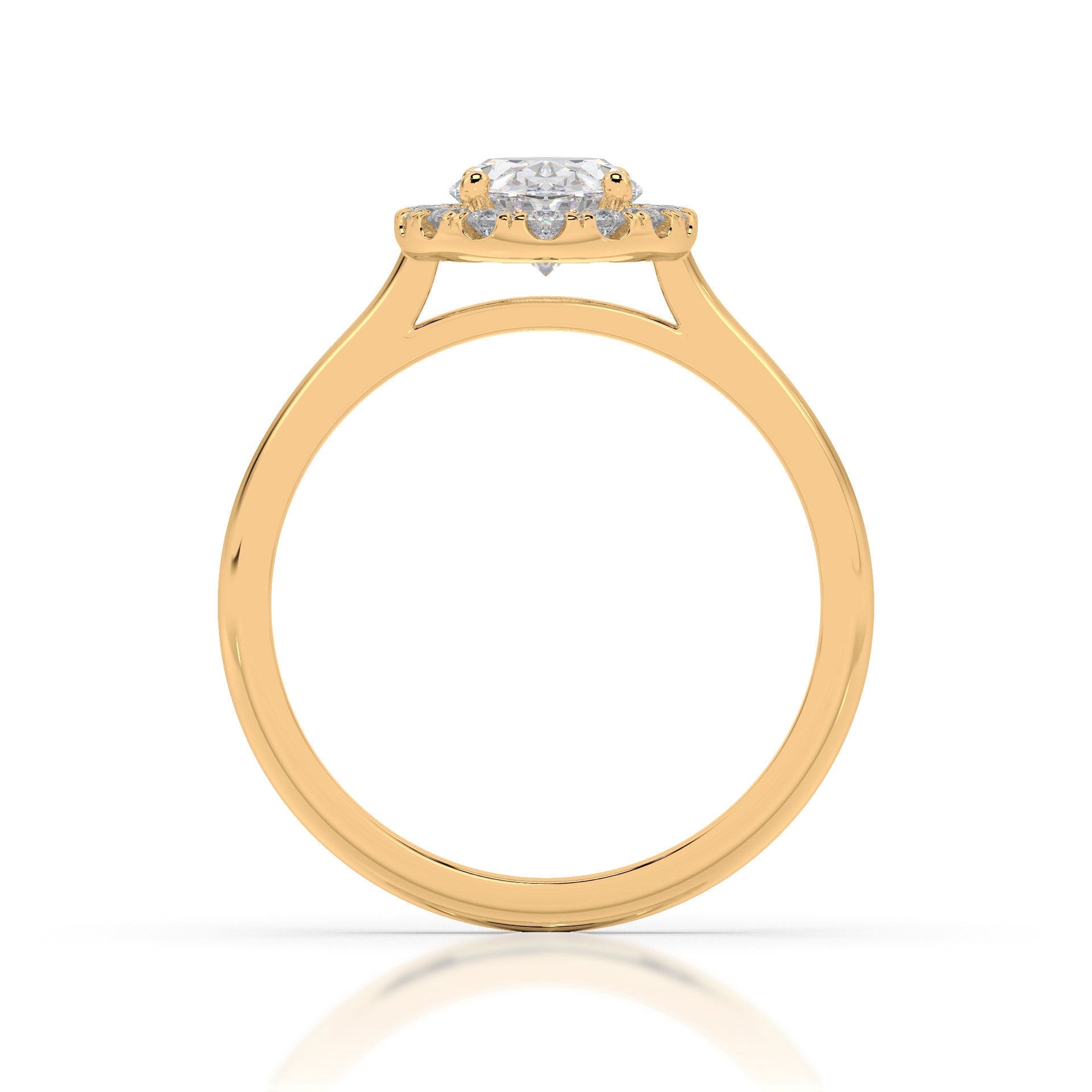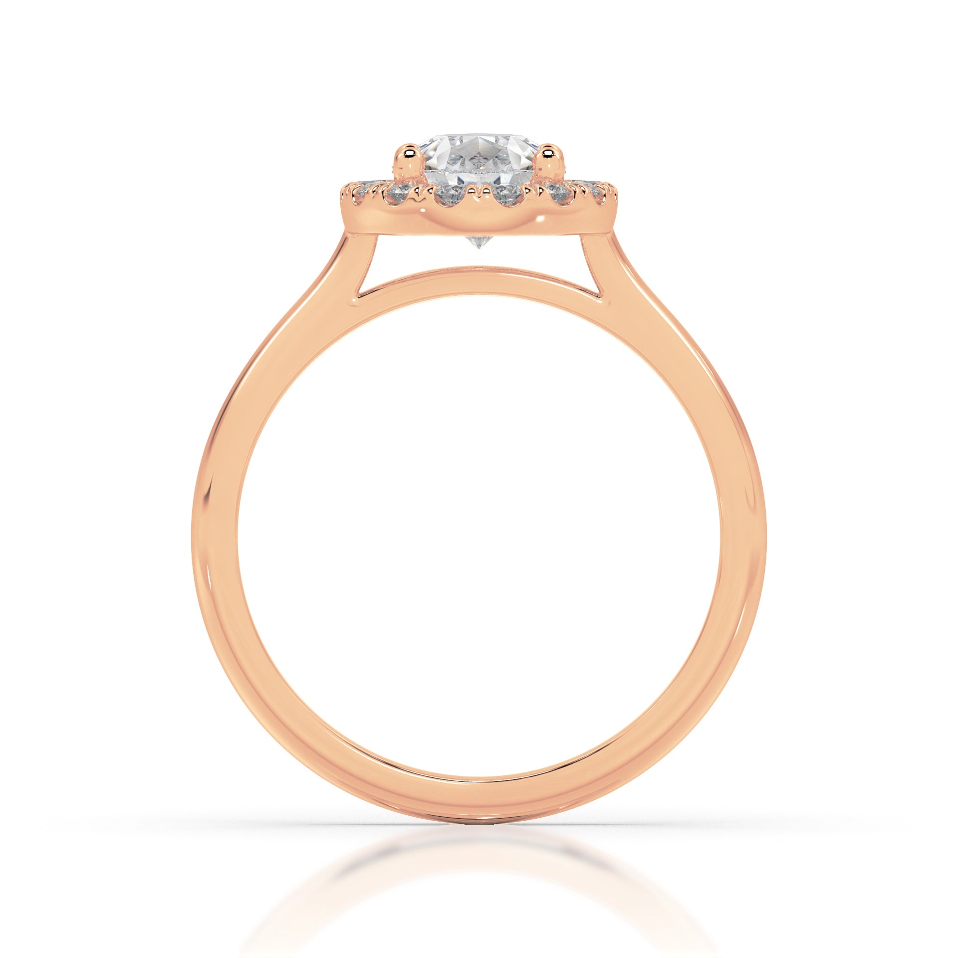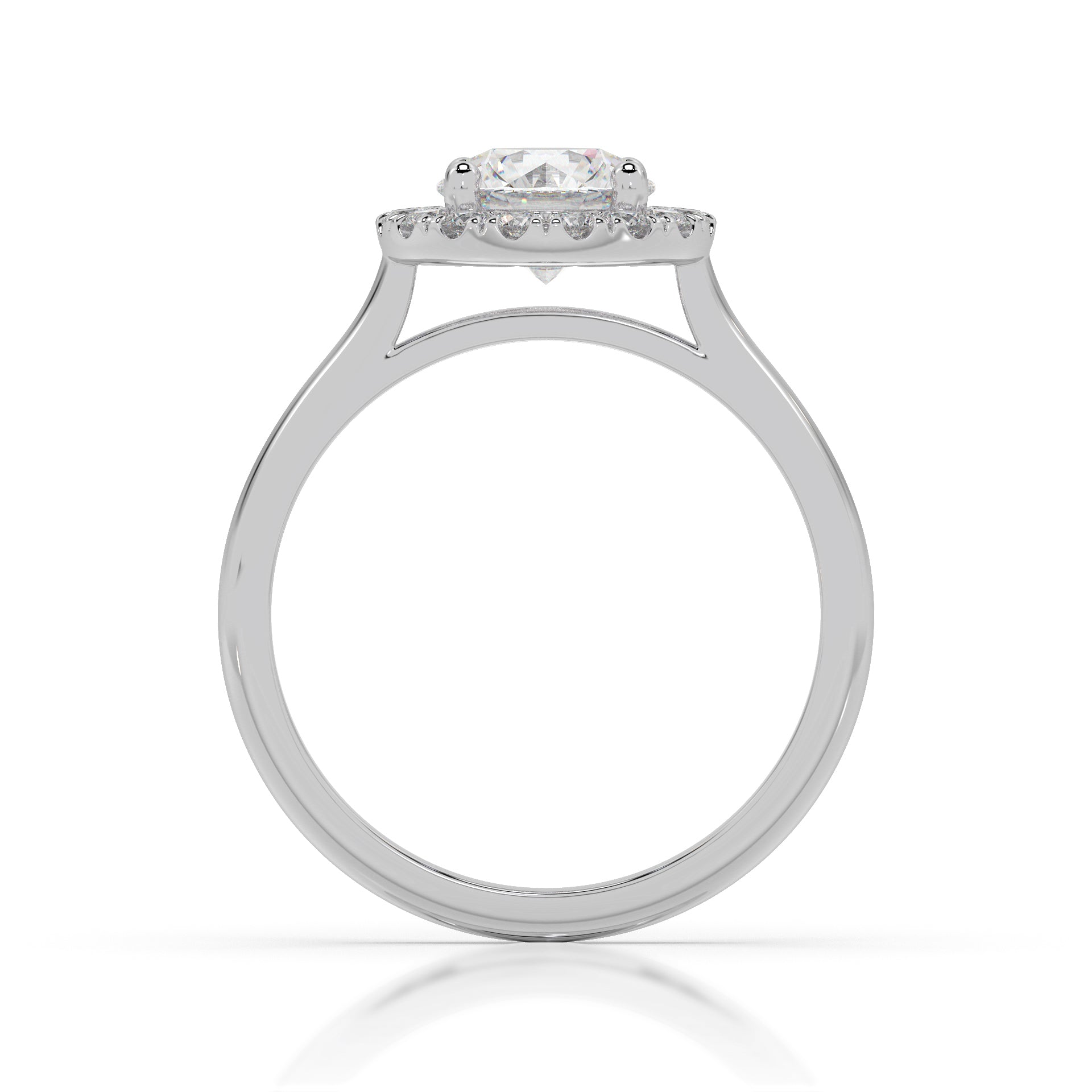 The centre stone is secured with 4 claws (pear-shape version in 5 claws, with an added point claw for protection). Halo diamonds are micro-claw set and back-holed for better cleaning. The setting sits slightly elevated, allowing a wedding band to nestle flush beneath.