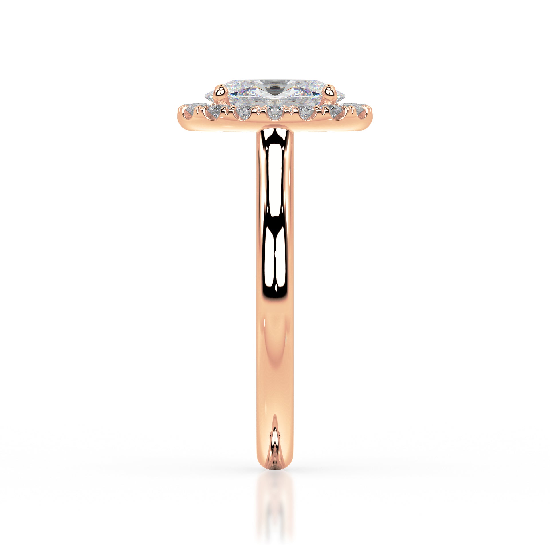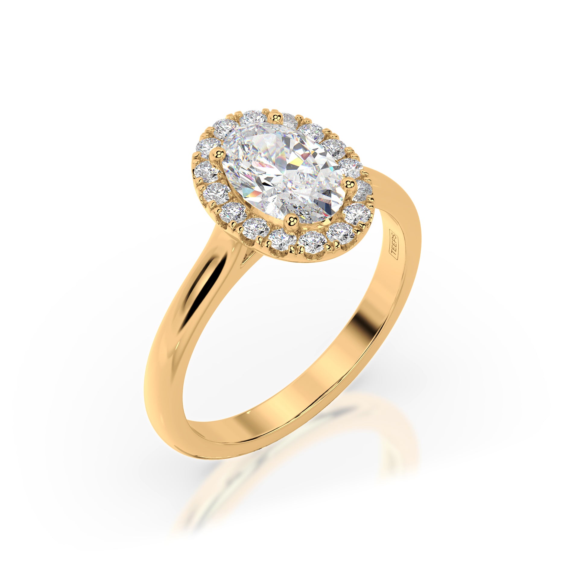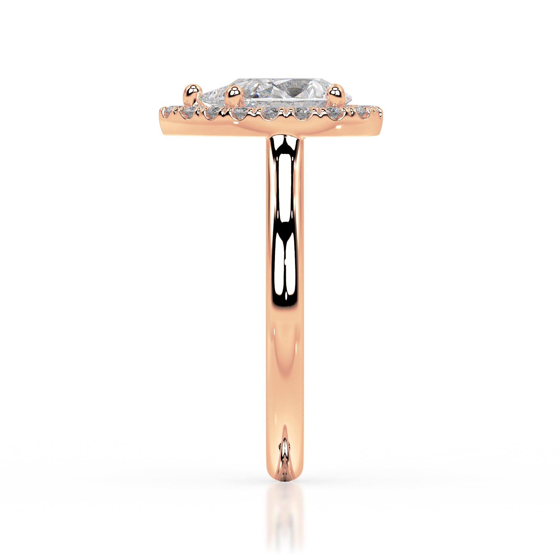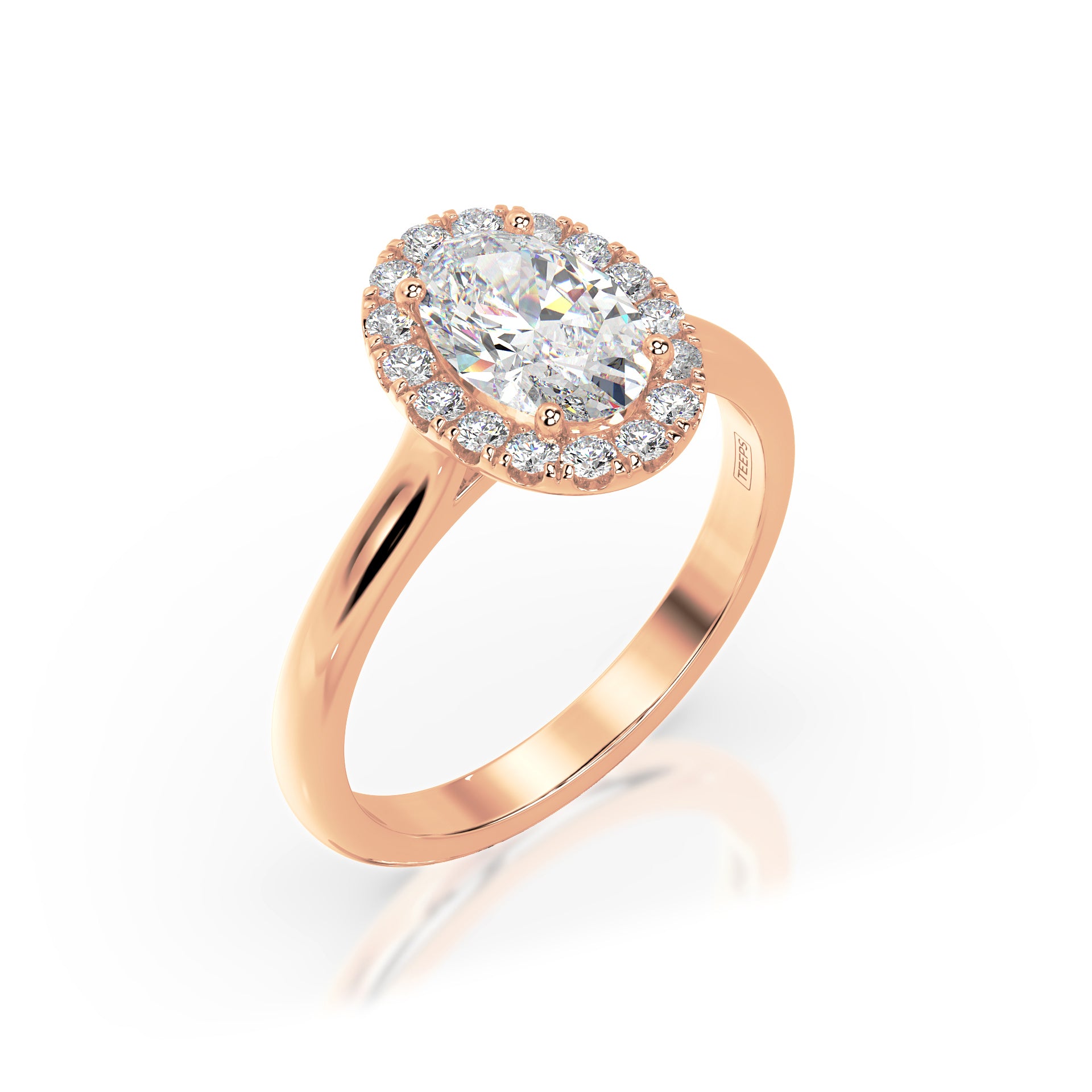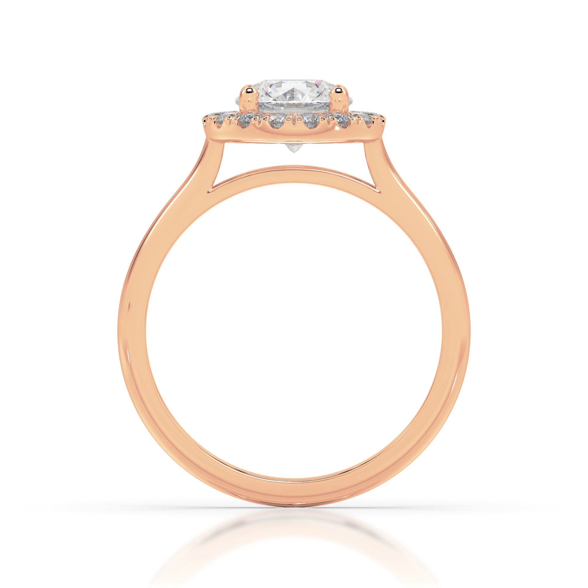 The centre stone is secured with 4 claws (pear-shape version in 5 claws, with an added point claw for protection). Halo diamonds are micro-claw set and back-holed for better cleaning. The setting sits slightly elevated, allowing a wedding band to nestle flush beneath.