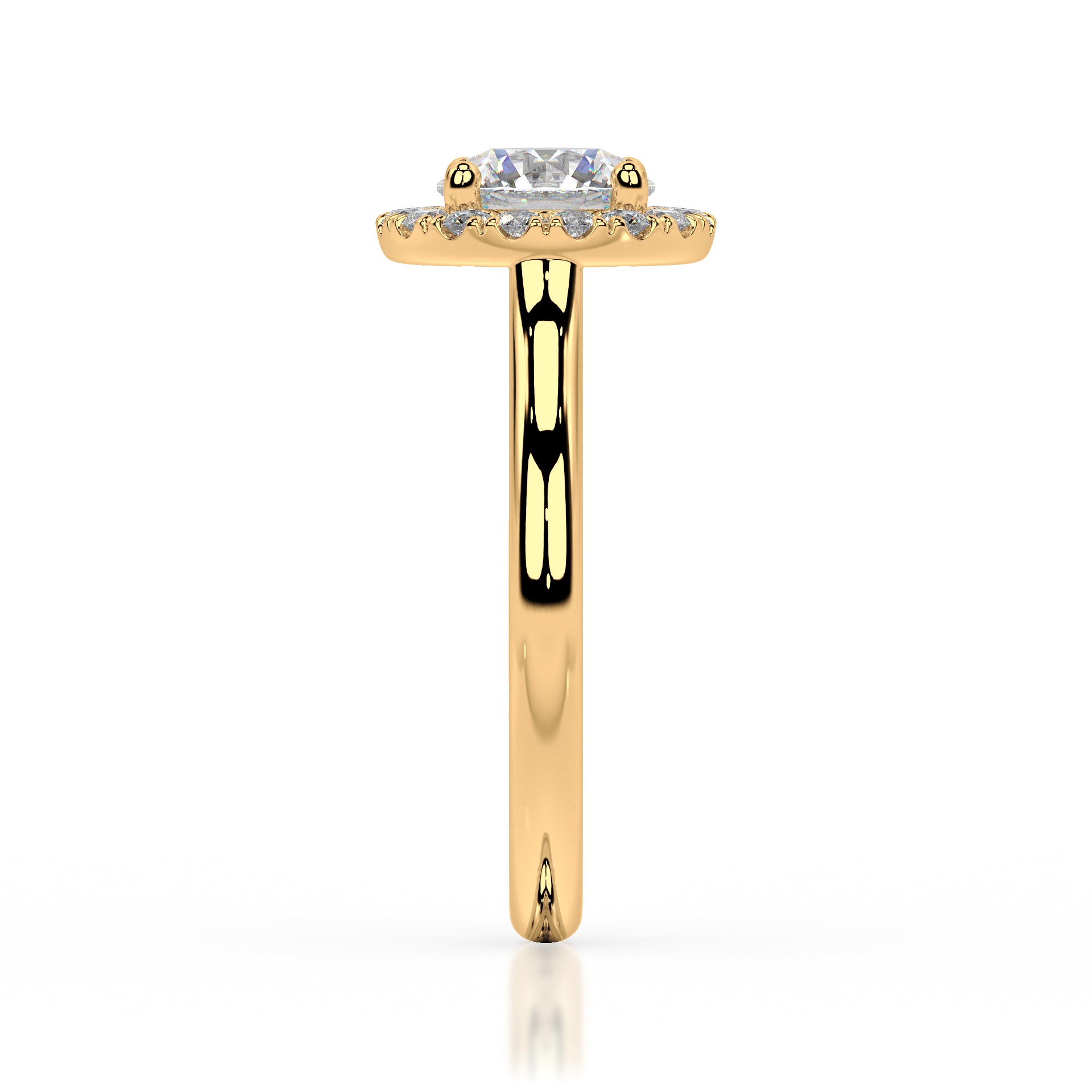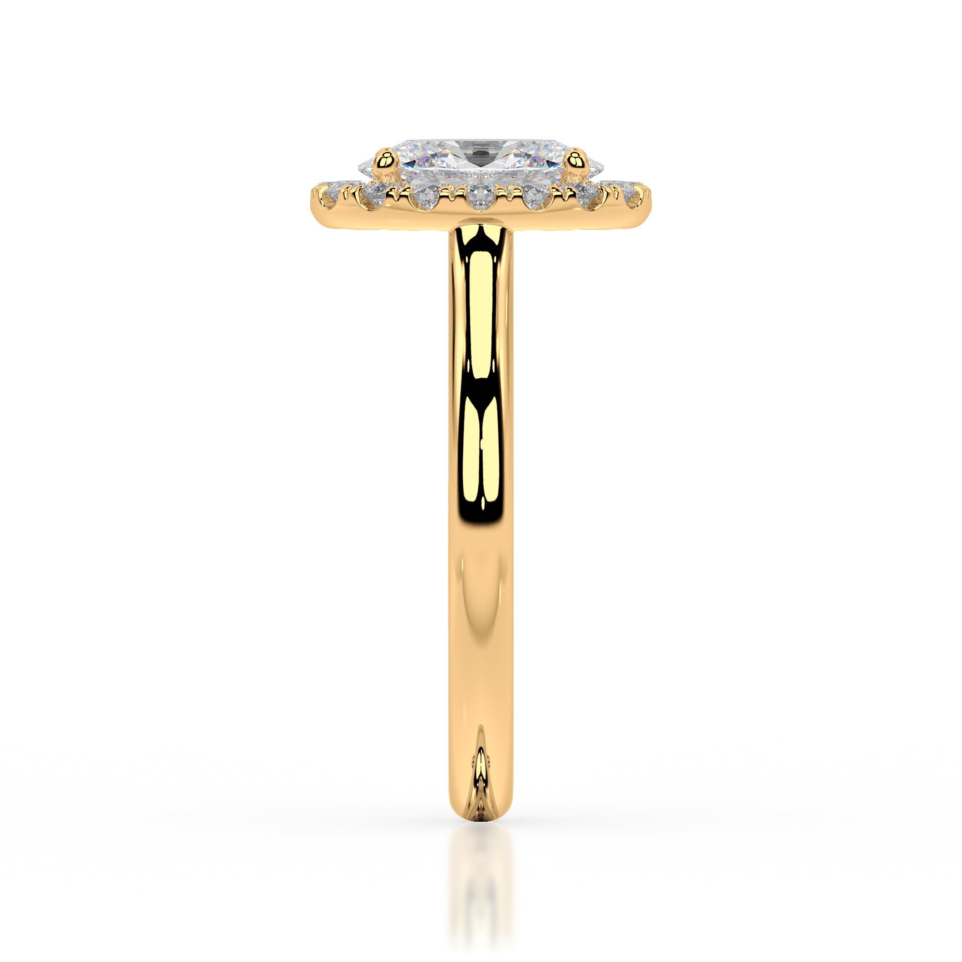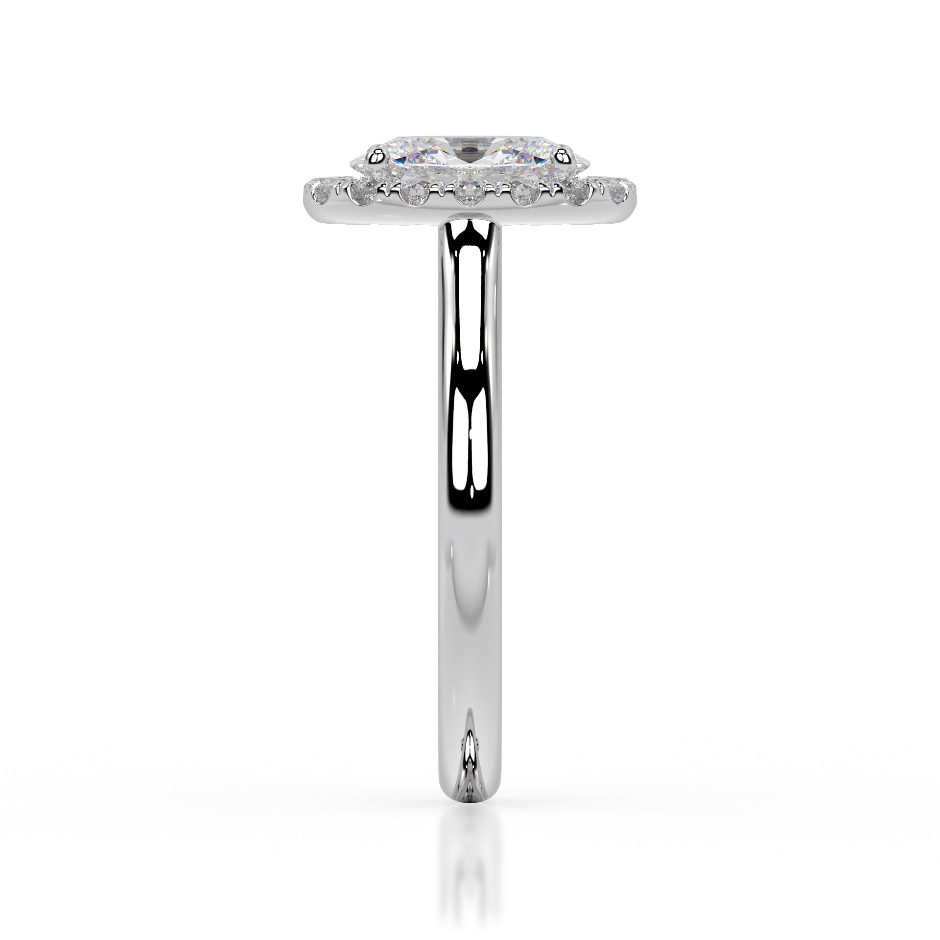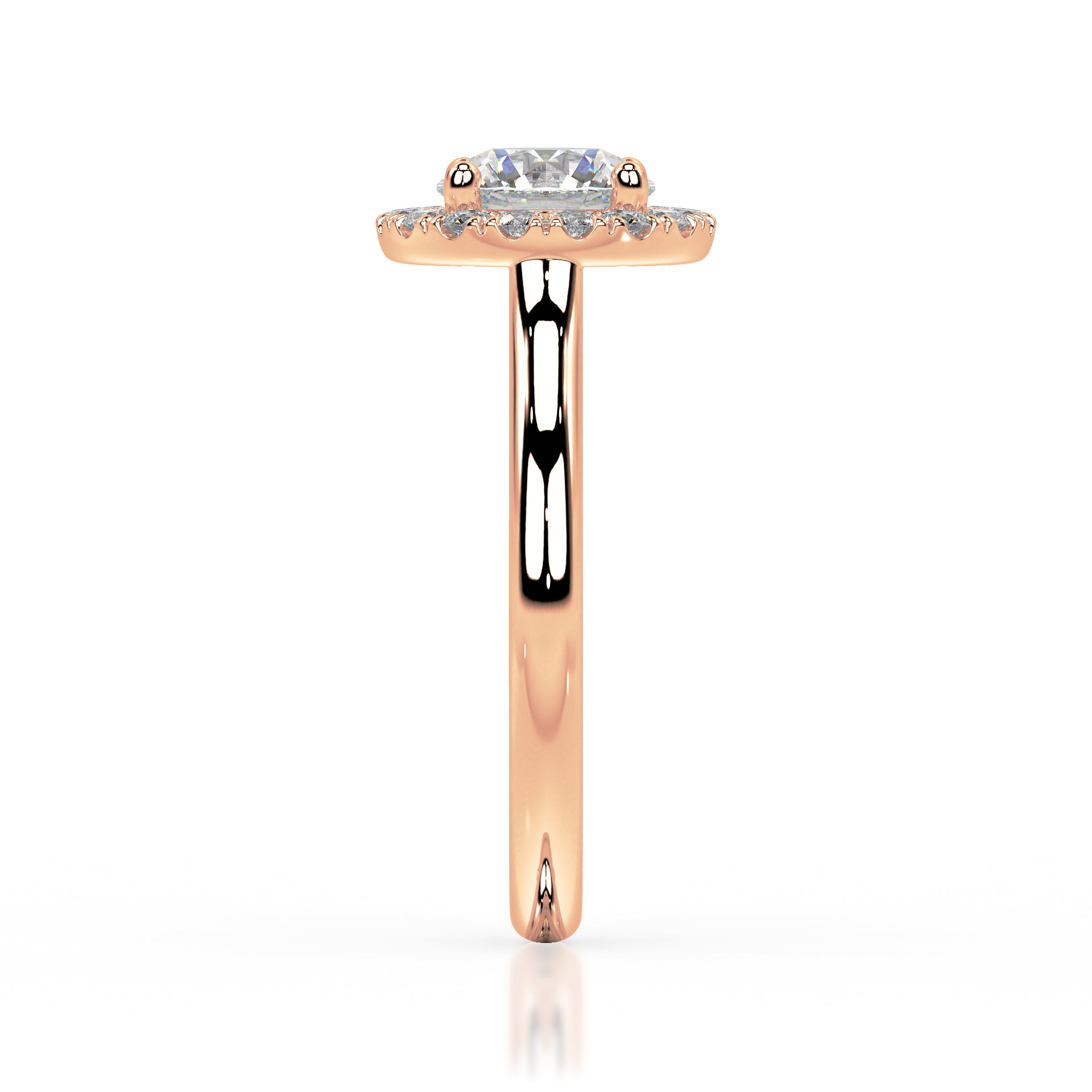 The centre stone is secured with 4 claws (pear-shape version in 5 claws, with an added point claw for protection). Halo diamonds are micro-claw set and back-holed for better cleaning. The setting sits slightly elevated, allowing a wedding band to nestle flush beneath.