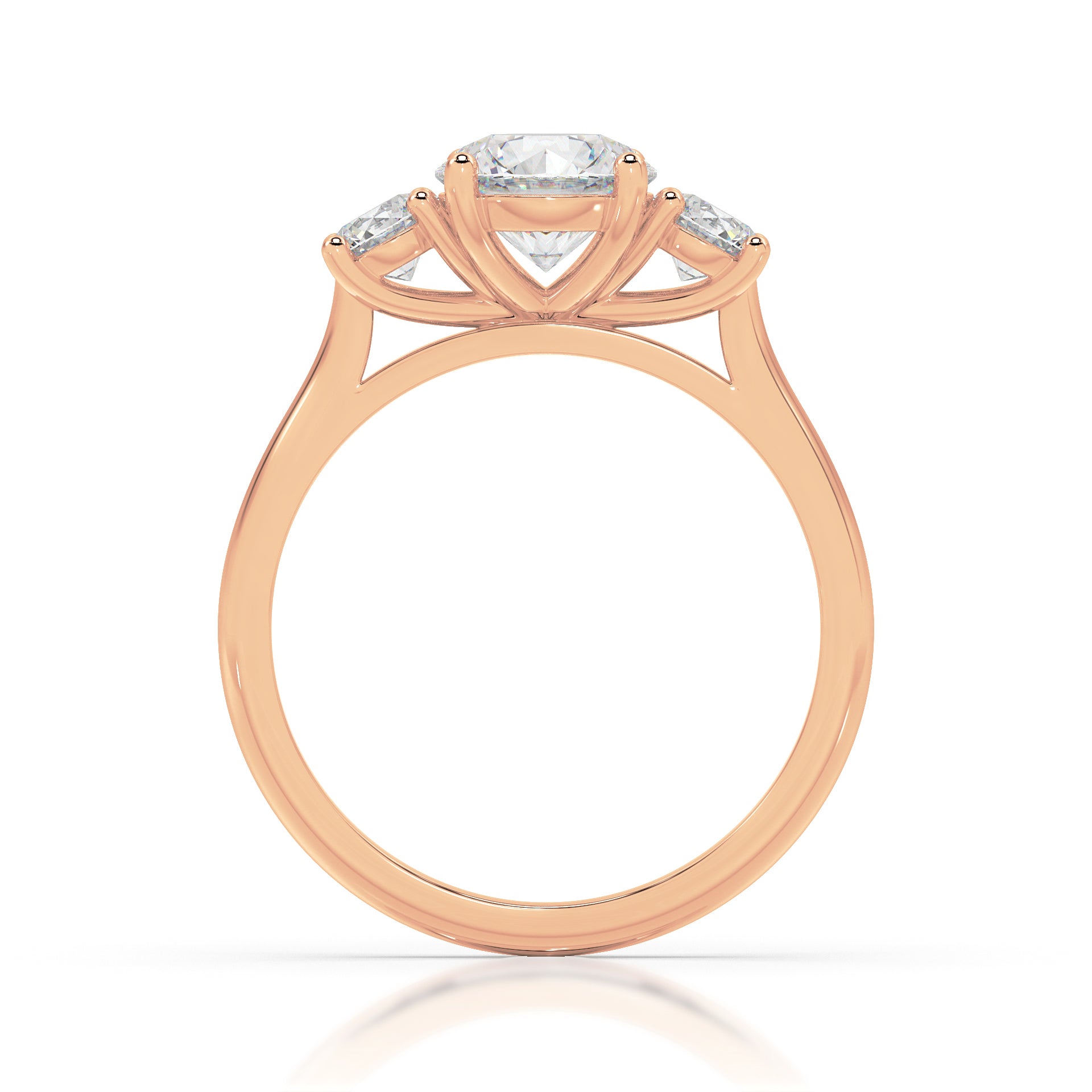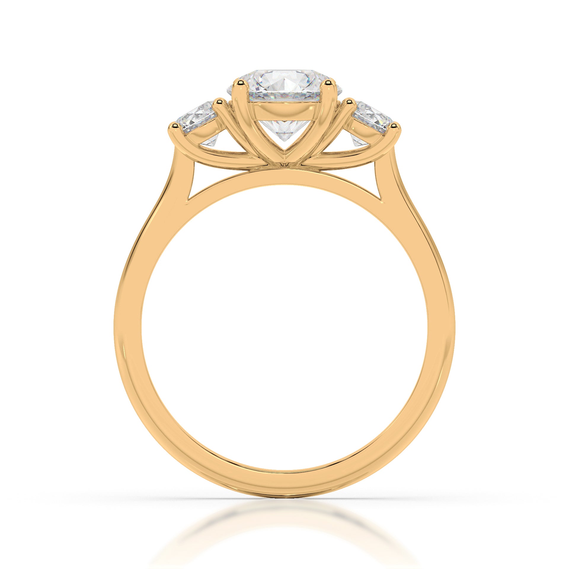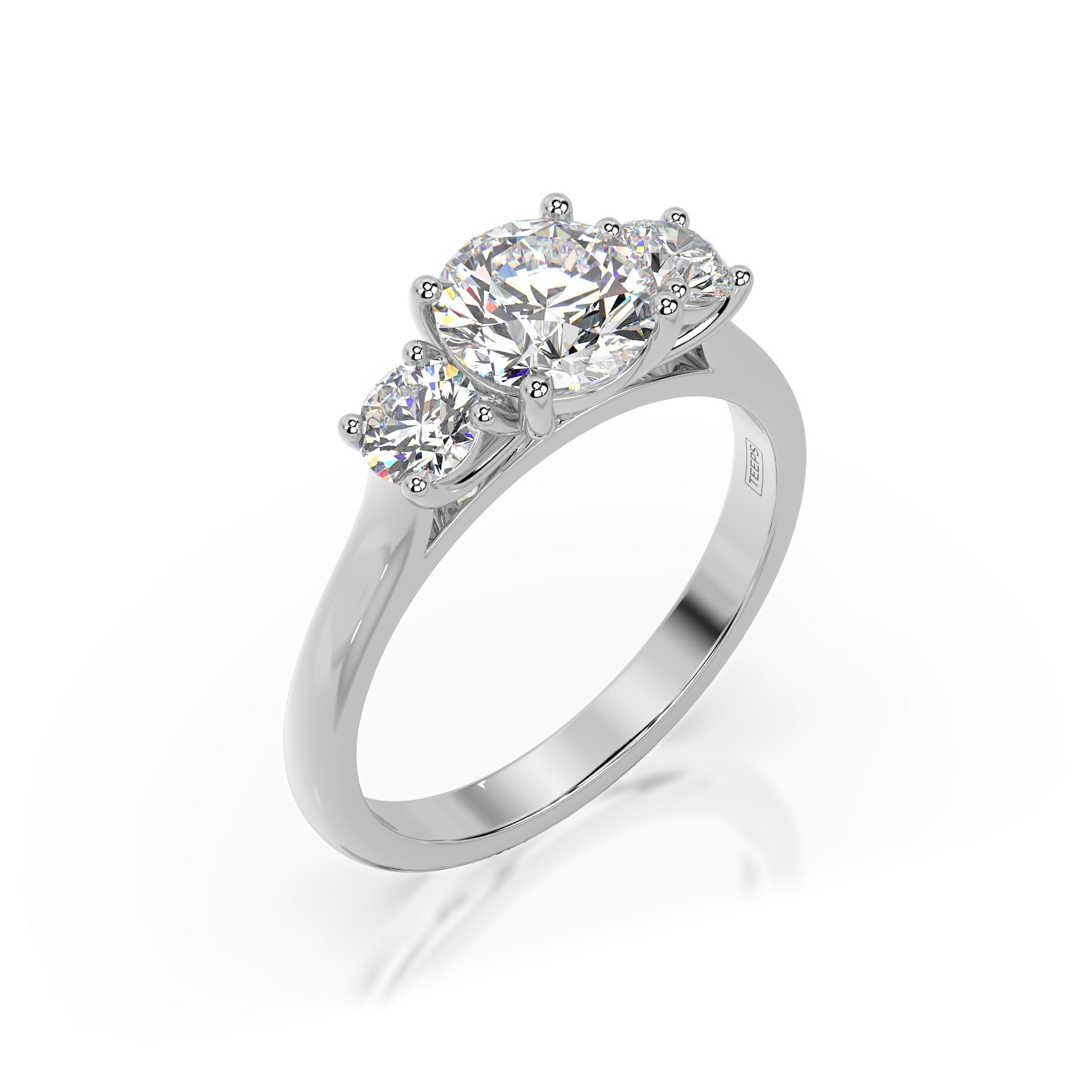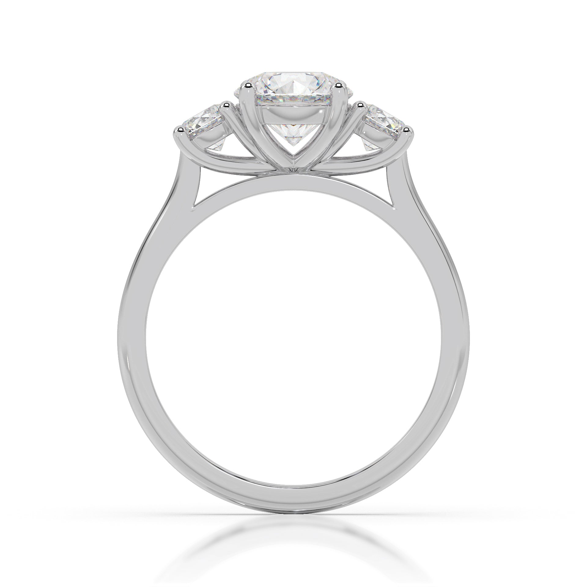 Three-stone basket in a classic cathedral style with upswept shoulders and an under-rail, designed so a wedding band can sit flush alongside.