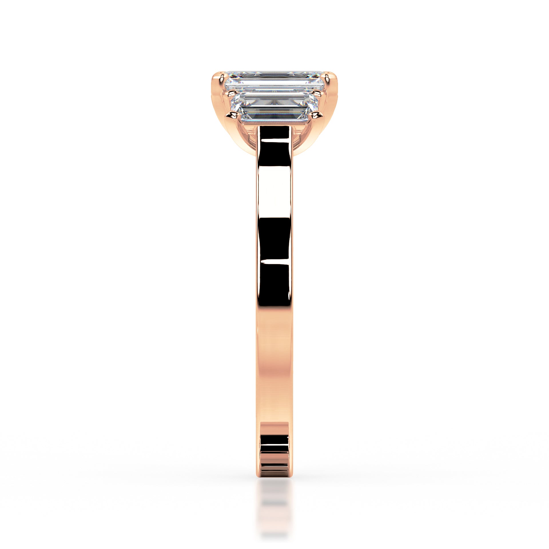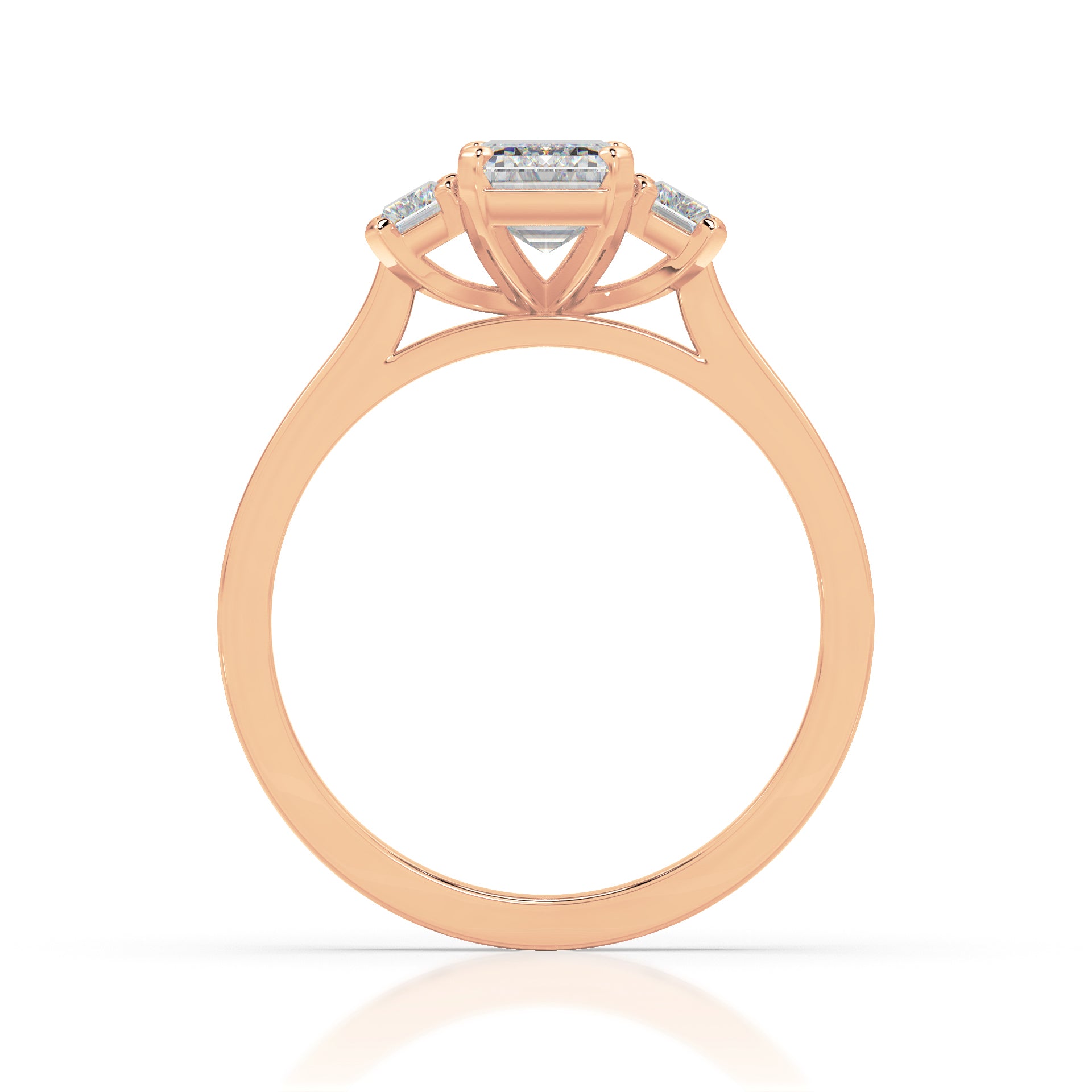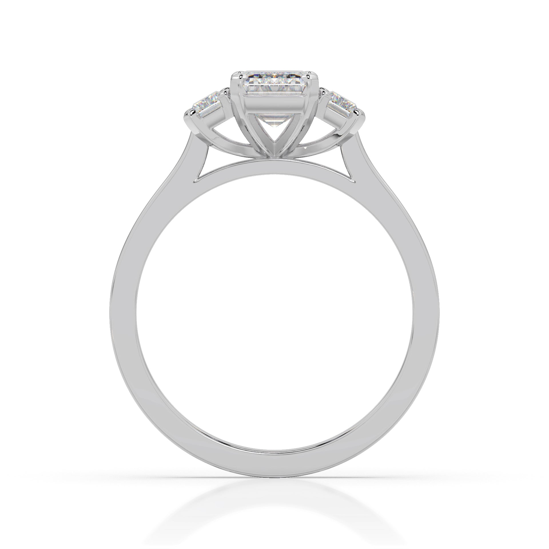 Round & oval centre stones are flanked by two 0.20ct round brilliant diamonds (approx. 3.8 mm each). Emerald-cut centre stones are paired with two 5 × 2.5 mm baguette diamonds (approx. 0.20ct each).